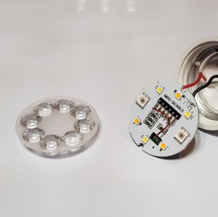 So, in theory it should be possible to disassemble 6 MiLight MR16s (or so I thought) and use the innards to replace the monochromatic LEDs inside the chandelier. The first point of investigation was into the MiLight MR16 RGB+CCT LED Downlight (shown below, along with a conventional halogen downlight for comparison purposes)