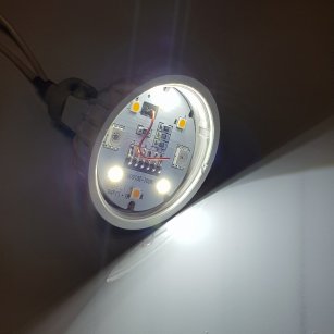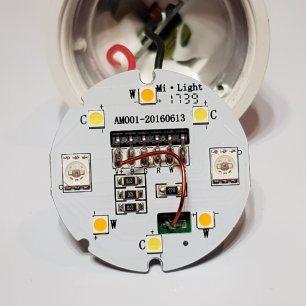 As expected the electronics inside are quite similar to what one would find by dismantling any of other MiLight LEDs such as this post (and is exactly the same board as found in the GU10 devices) but it has a second PC board which hosts the microcontroller attached to the bottom of the LED board (shown below). Jumpers from the microcontroller board are literally bent over and soldered to the top board, thus making it impossible to view the microcontroller board without damaging the light. Also notable is the additional pin to drive the CCT.