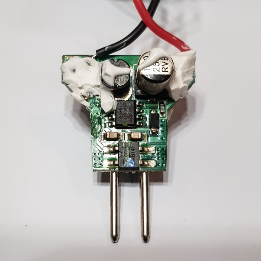 The housing holds a PCB to which surface mount LEDs are soldered. There are two small screws which hold the PCB to the inside of the housing. Once these are removed it reveals a power supply mounted at the base of the housing with some form of silicone. The PCB itself is just slightly less than 40mm in diameter which makes it almost exactly the right size to replace the plain white LEDs in the chandelier.